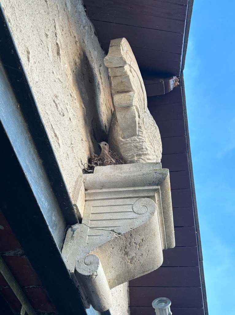 Un couple de tourterelles a élu domicile au pied du coq en plâtre de la Maison du Coq !