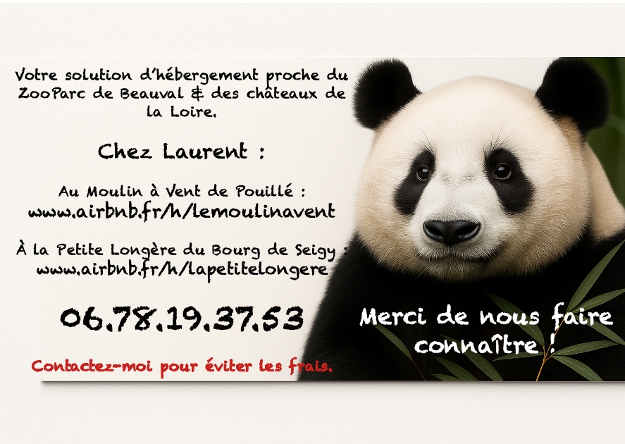 1000 cartes de visite ont été commandées en partenariat avec le Moulin à Vent de Pouillé & la Petite Longère du Bourg de Seigy de mon ami Laurent. Voici les visuels du recto & du verso de la carte que nous avons réalisés hier soir. Cela vous permettra de changer de meublé de tourisme, de revenir ou de nous faire connaître autour de vous.