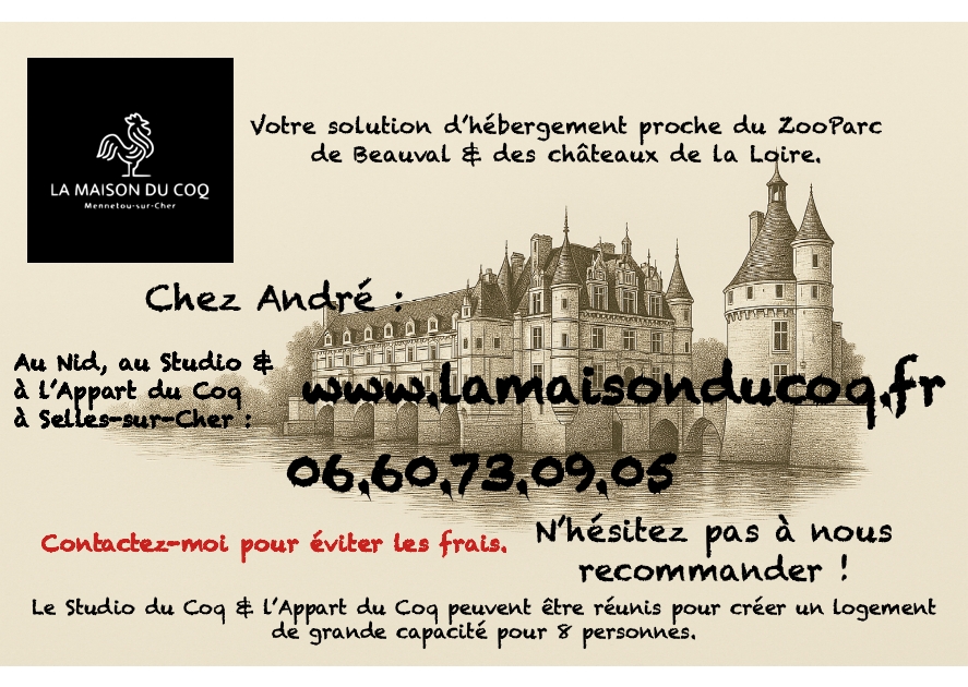 Ces vendredi 9 & jeudi 10 juillet 2025, le site Internet de la Maison du Coq a été mis à jour. En effet, le site a complètement été refondu. La Maison du Coq devient l’entité qui héberge trois meublés de tourisme à Selles-sur-Cher, à savoir le Nid du Coq, le Studio du Coq & l’Appart du Coq (ce dernier fermé pour cause de travaux). L’ancien meublé de tourisme de Mennetou-sur-Cher devient le siège où je gère les meublés de tourisme.
