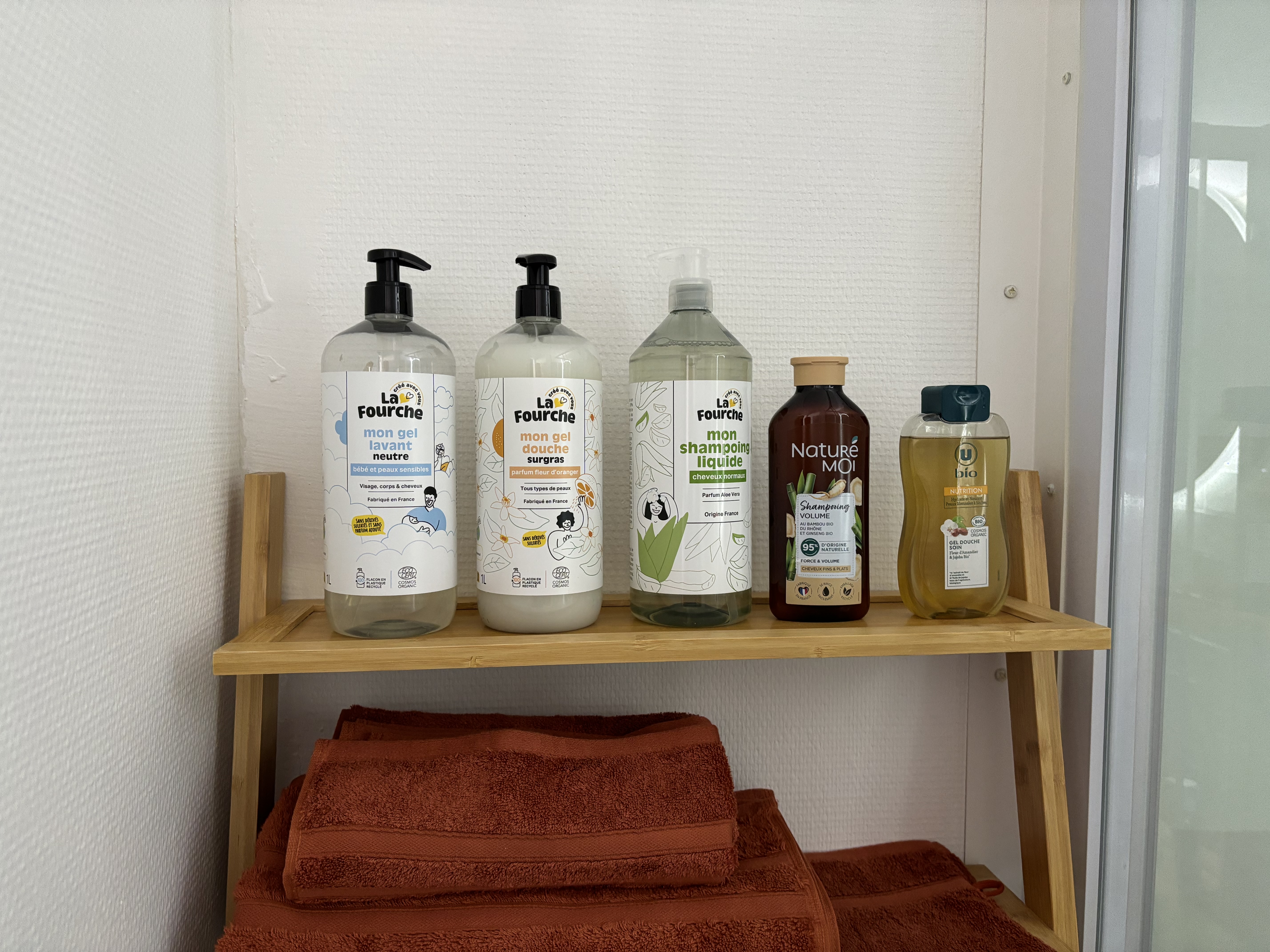 Une douche, deux serviettes par voyageur, un gant de toilette, du shampooing & du gel douche bio offerts. Un sèche-serviettes THERMOR fabriqué en Europe. Un sèche-cheveux VELECTA fabriqué à Romorantin-Lanthenay est disponible dans le meuble bas.