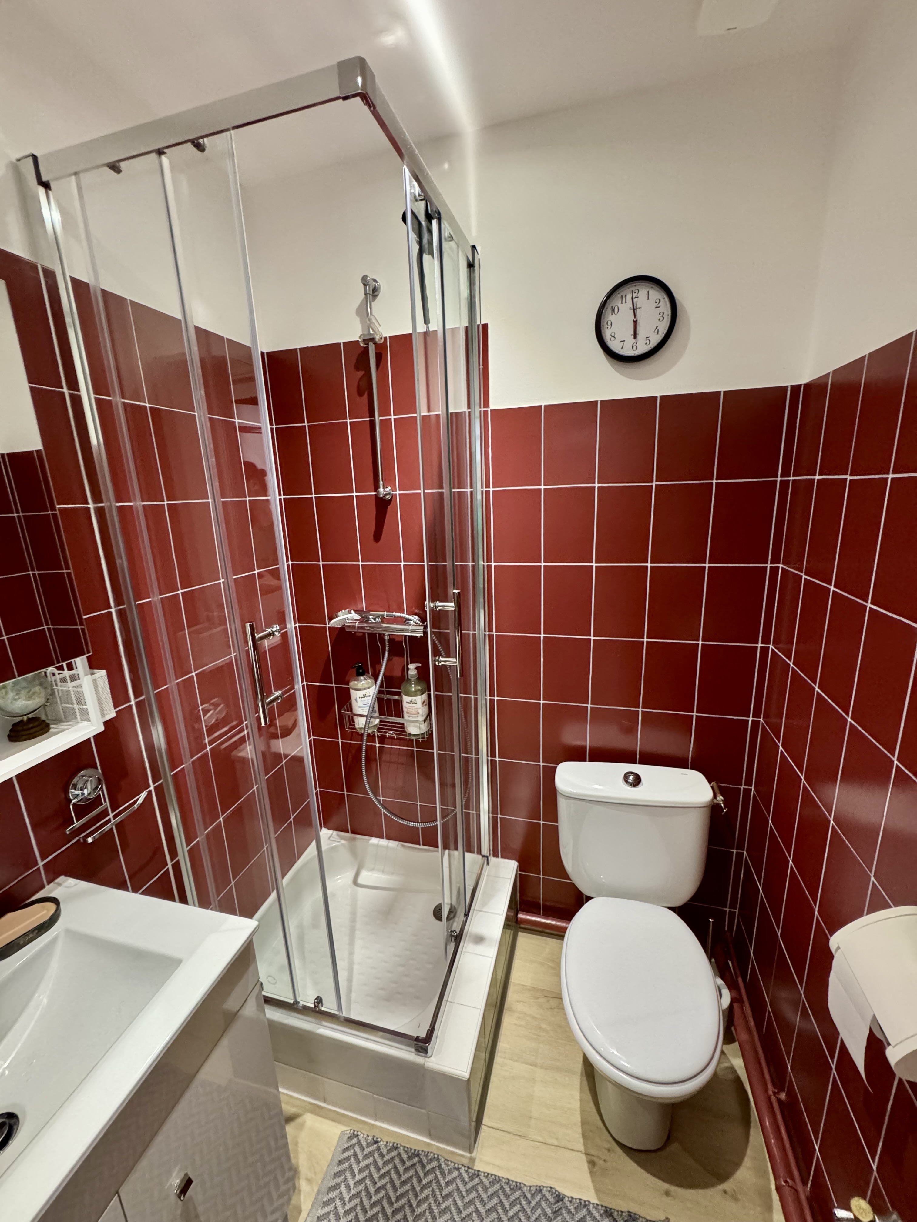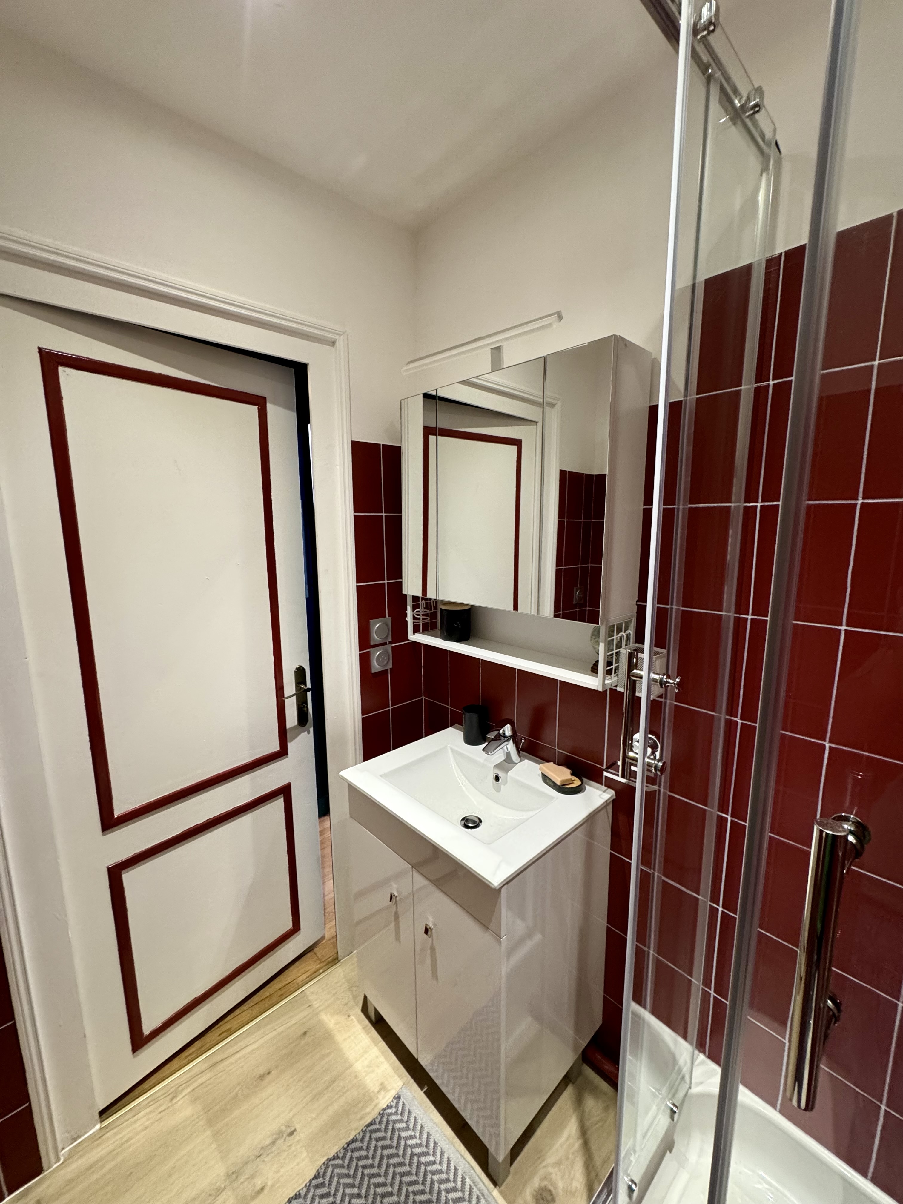 Une salle d’eau avec une toute petite douche qui ne convient pas aux personnes de forte corpulence. Vous trouverez dans le meuble du bas un sèche-cheveux made in Romorantin-Lanthenay dans le Loir-et-Cher de la marque VELECTA. Un sèche-serviettes complète l’ensemble.