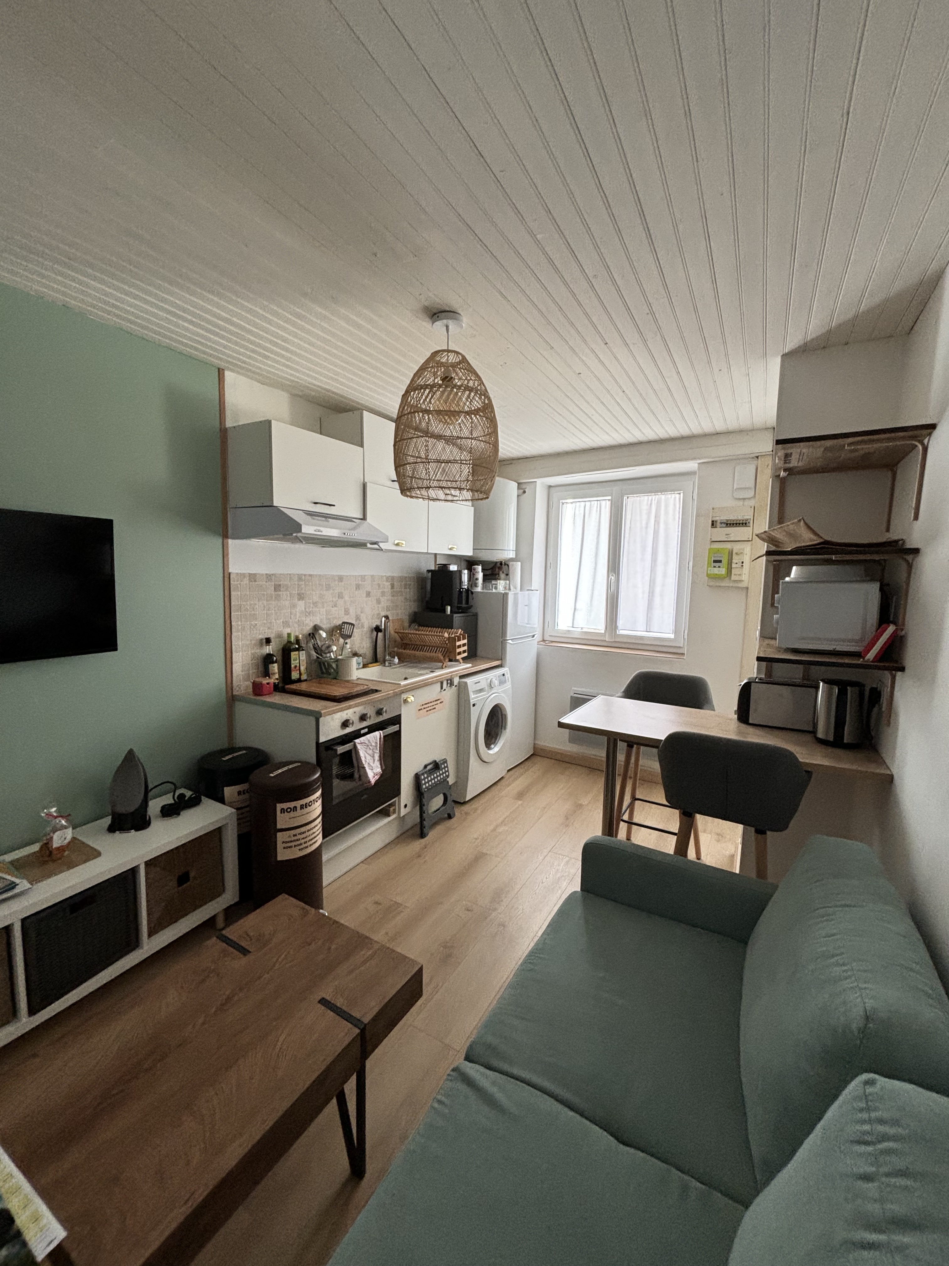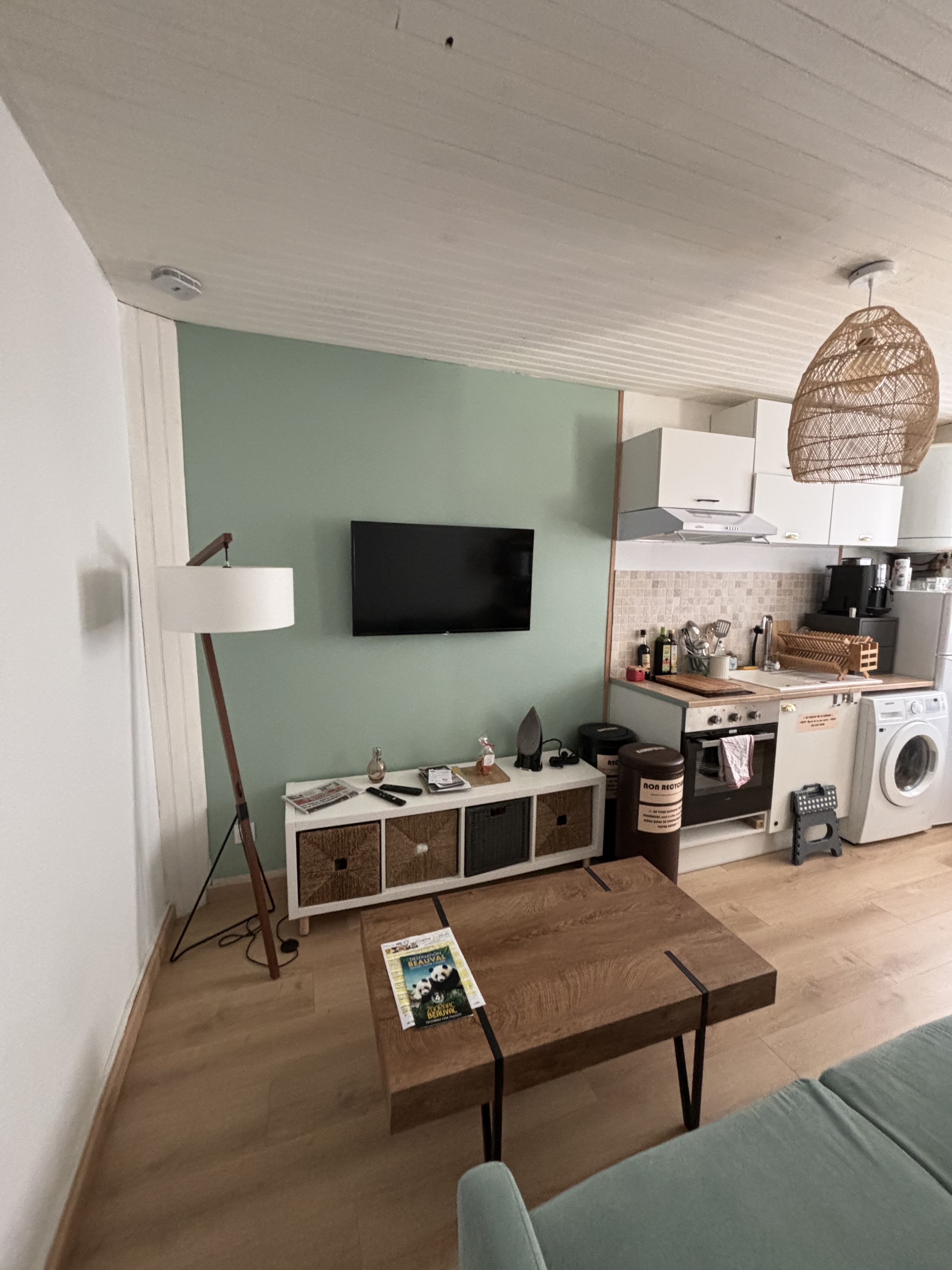 Le salon est équipé d’un canapé non convertible, d’un écran TCL connecté à l’application OQEE by Free pour avoir les chaînes. Vous y trouverez le fer à repasser, des prospectus (l’office de tourisme est à 300 mètres) et une lampe sur pied.